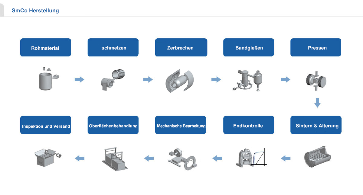 SmCo (Samarium-Cobalt) -Magnete haben eine bessere thermische Eigenschaft im Vergleich zu NdFeB-Magneten. Auch der Korrosionswiderstand ist leistungsf?higer, so dass keine Oberfl?chenbehandlung erforderlich ist. Die reversible thermische Entmagnetisierungsrate von SmCo-Magneten betr?gt 1/4 bis 1/3 der Rate der NdFeB-Magneten. Einige Typen von SmCo-Magneten k?nnen bei über 250 ° C eingesetzt werden. Wie bereits erw?hnt, werden SmCo-Magnete h?ufig in Automobilteilen und / oder in widrigen Umgebungen, wie hitzebest?ndigen Motoren und Pr?zisionsmagnetsensoren, eingesetzt.