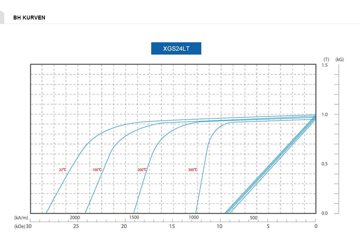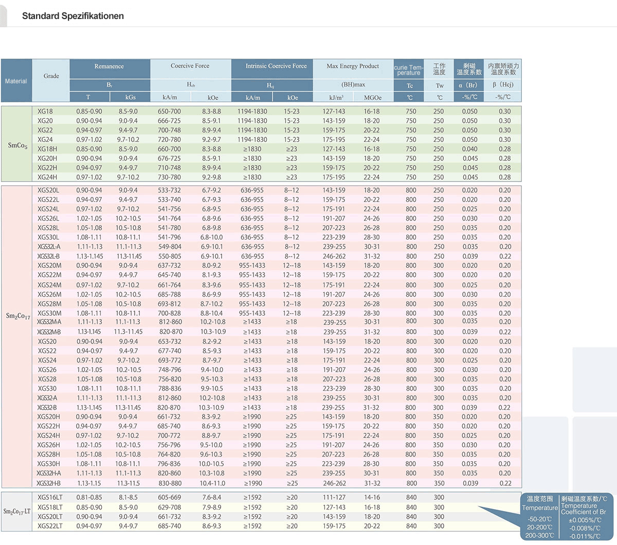 TH bietet zwei Arten von SmCo-Magneten an: Typ 1-5 und Typ 2-17 mit verschiedenen Qualit?ten. Bei einem 2-17-Typ k?nnen wir die Koh?sionskraft iHc für die F?higkeit des Magnetisierers, den die Kunden verwenden, individuell regulieren. Wir k?nnen, neben allgemeinen Sorten, auch Magnete mit besonders niedrigem W?rmekoeffizienten der Br (-0.OO8% / Grad: 20 bis 200 ℃) "LT-Serie herstellen.