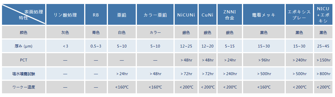 >> 無機系コーティング:ユニクロメッキ、カラー亜鉛メッキ、ニッケルメッキ、NICUNIメッキ、ZnNi合金メッキ
