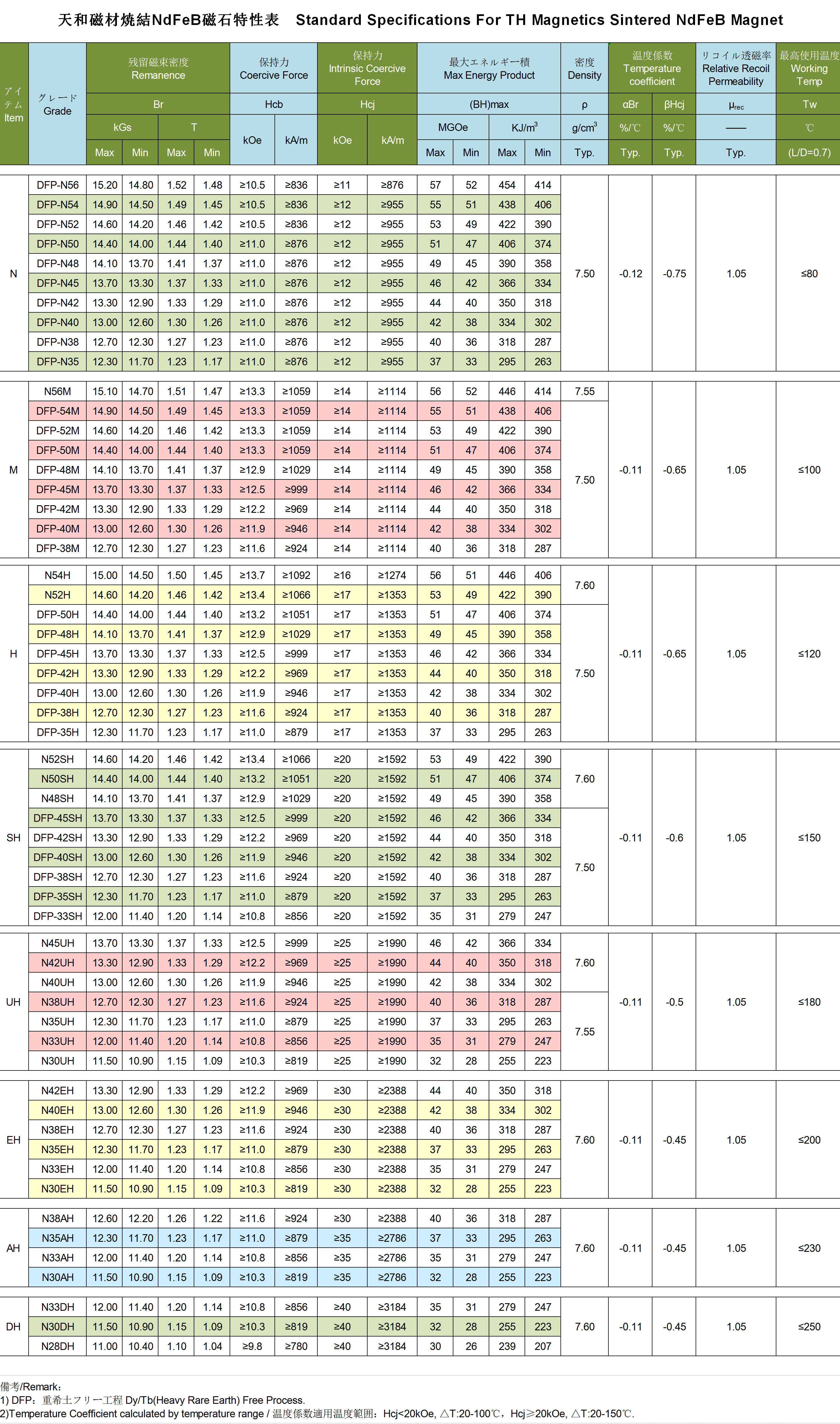 | 保磁力温度係数(β(Hcj))/(%/K) | -0.42~-0.70 | |