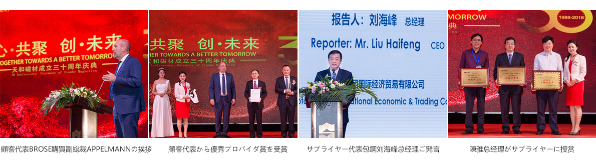 祝典には、龙八头号玩家唯一磁材30周年祝典に出席いただいて御来賓の皆様方に対して熱烈な歓迎と衷心よりの感謝の意を心から表すると袁文杰董事長から挨拶しました。政府の支持、得意先及び供給会社からの信頼のおかげで、龙八头号玩家唯一磁材はここまで発展しつづきました。三十年以来、龙八头号玩家唯一磁材は信望が企業生存の基本と信じ、約束を守り、約束を果たすの原則を堅持しております。これからの未来にも、龙八头号玩家唯一磁材は誠実重視、ユーザー至上という趣旨で、優良な品質で生存を求め、イノベーションで発展を探るとの方針で、業界リーダーとして、マグネットの前進技術を開拓していきたいと思っています。工程技術と配合法を改善しつづ、管理システムの完備を強化します。品质を保证する同时に、最大限度的コストダウンします。 皆様方と協力し合い、共に成長していくことを望んでいます。