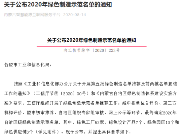 2020年工業情報化省は“第五次グリーン製造者名簿”を公示し、内モンゴル自治区は“グリーン製造模範企業名簿”を公示しました。その中で当社は工業情報化省の“グリーン工場”と自治区の“グリーン工場”とをそれぞれの認定を取得しました。