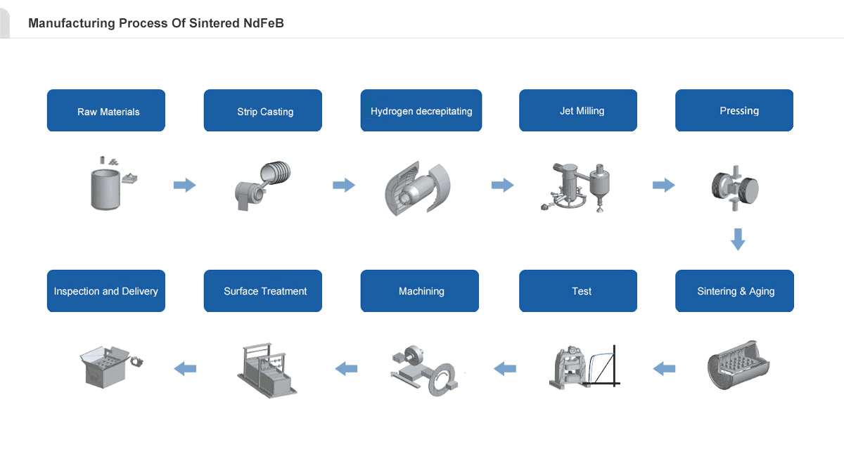 Neodymium Iron Boron (NdFeB), also known as Rare Earth Iron magnets are mainly comprised of iron, neodymium, boron and other trace elements is the strongest permanent magnets currently produced and has excellent magnetic properties, which allow this third generation magnetic material to be compact in size over traditional permanent magnets.
