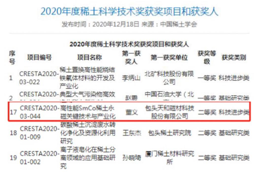 In December 2020, according to the announcement of Rare Earth Science and Technology Award jointly established by The Society of Rare Earths of China and Association of China Rare Earth Industry, the project “Key Technology and Industrialization of High Performance SmCo Rare Earth Permanent Magnet” of THmag won the second place in 2020 Rare Earth Science and Technology Progress Award.