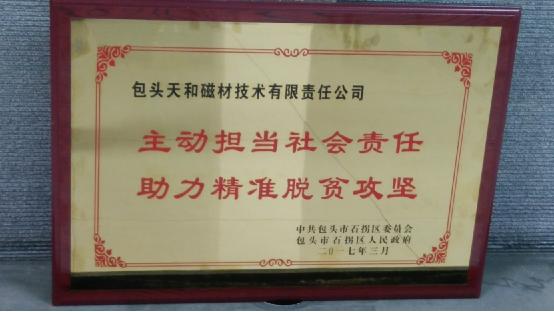 2017年4月10日上午10:00,石拐区政府及领导班子带着印有“主动担当社会责任,助力精准脱贫攻坚”的牌匾,送到袁文杰董事长的手中并表示感谢。龙八头号玩家唯一磁材一直倡导社会责任,当得知包头市石拐区五当召镇(市级贫困镇)中刘月英等5户贫困户,家中因年老体弱和疾病等原因,生活非常困难,在石拐区政府的倡导下,龙八头号玩家唯一磁材主动为这些家庭捐献10万元人民币缴纳养老保险,保障基本生活。