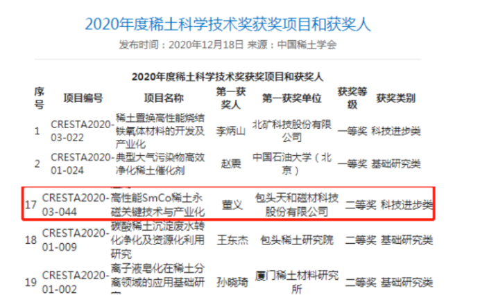 2020年12月,根据中国稀土学会、中国稀土行业协会联合设立的稀土科学技术奖公示,公司的《高性能SmCo稀土永磁关键技术与产业化》项目荣获2020年度稀土科学技术进步奖二等奖。